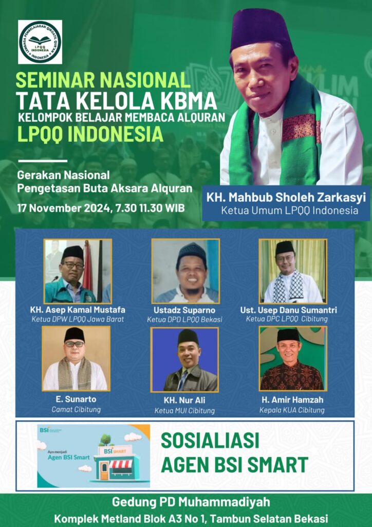 Cibitung, 17 November 2024 – Dalam rangka mendukung Gerakan Nasional Pengentasan Buta Aksara Al-Qur’an di Indonesia (GerNas LPQQ Indonesia), sebuah seminar nasional bertajuk “Pengelolaan KBMA LPQQ Indonesia” diselenggarakan pada hari Ahad, 17 November 2024, di Gedung Pusat Dakwah PDM Kabupaten Bekasi, Komplek Metland Blok A3 No.1, Tambun, Kabupaten Bekasi. Seminar ini diikuti oleh berbagai pihak, termasuk pemangku kepentingan di tingkat kecamatan dan kabupaten, serta masyarakat yang peduli terhadap pengelolaan KBMA (Kelompok Belajar Mengaji Al-Qur’an).