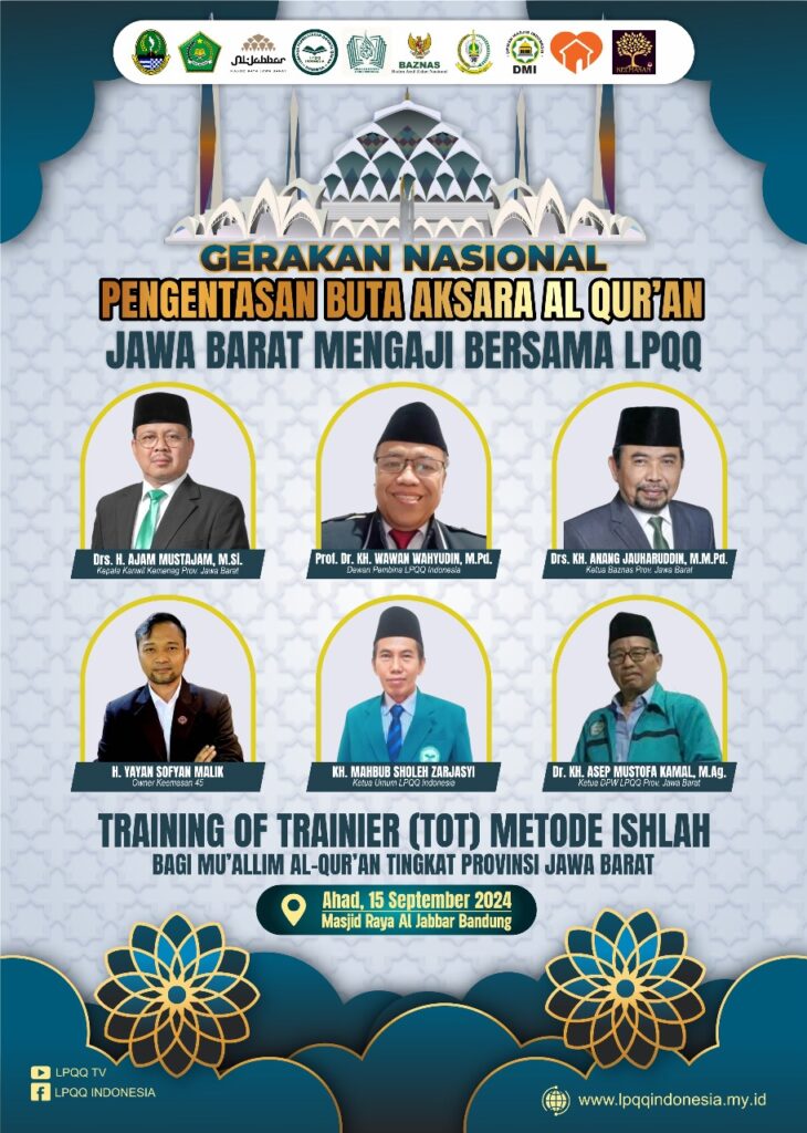 Bandung, Ahad 15 September 2024 LPQQ (Lembaga Pembelajaran Qiroatil Qur’an) Indonesia Telah melaksanakan TOT yang Bertema “Jawa Barat Mengaji” telah di laksanakan dengan Sukses & Khidmat oleh LPQQ Indonesia. Yang di hadiri oleh 3500 Mualim Al-Quran yg dilaksanakan di masjid Raya Al-Jabbar disupport oleh Keemasan 45 & Rumah Zakat.